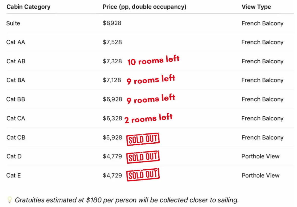 Cabin Categories & Pricing (as of October 1, 2025) Each booking will require repricing.